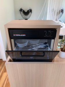 法令で定められている消毒基準を上回る消毒器で終了次第、取り出して使用しております。