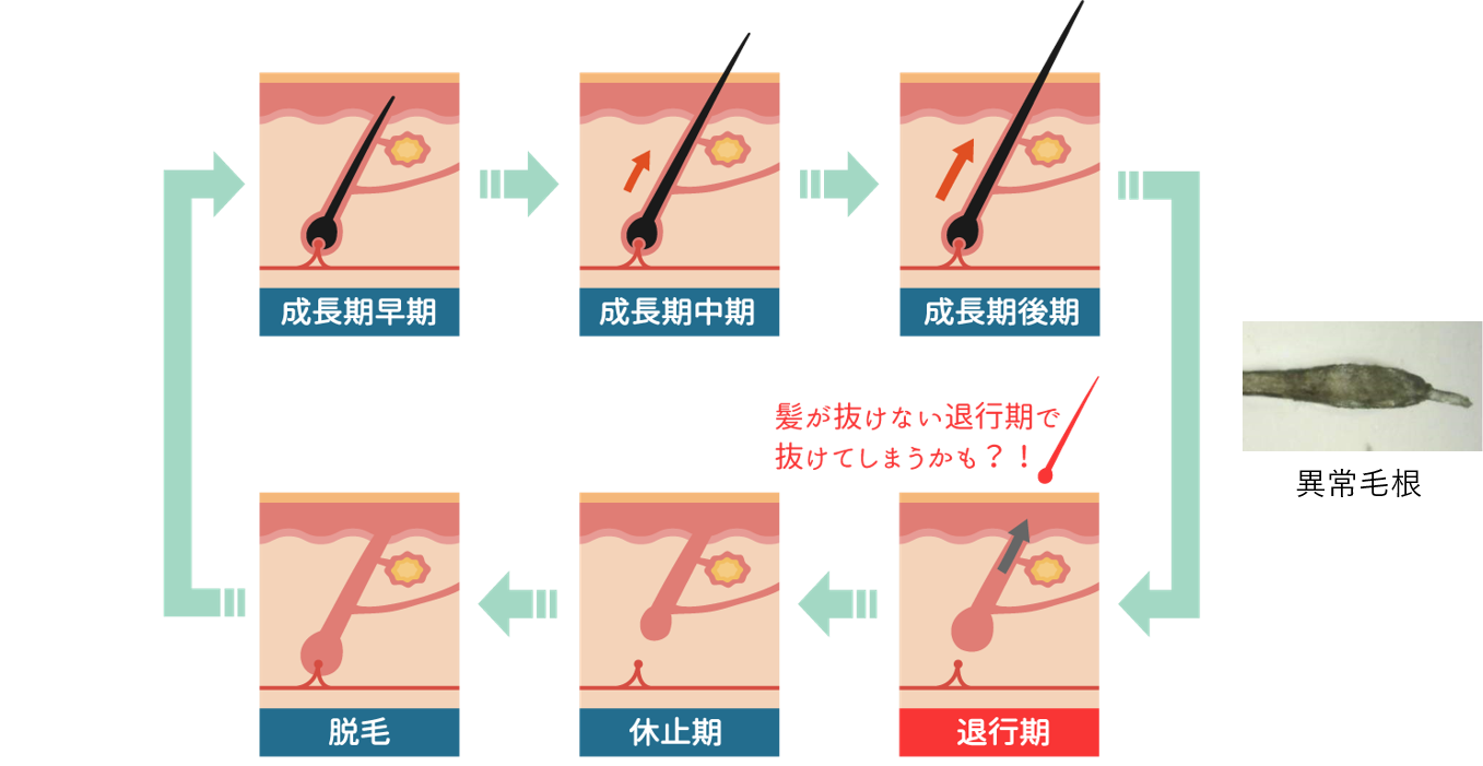 異常毛根が増加することで、成長期の短縮、休止期の延長といったヘアサイクルの乱れが生じます。