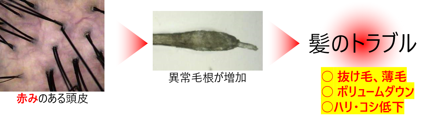 頭皮の赤みが増えると、異常毛根が増加し、抜け毛が増える。