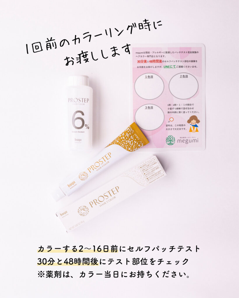 頭皮健康&カラーサロンmegumiのヘアカラーは、頭皮チェック&パッチテストを完全実施している「2回来店モデル」を採用しています。