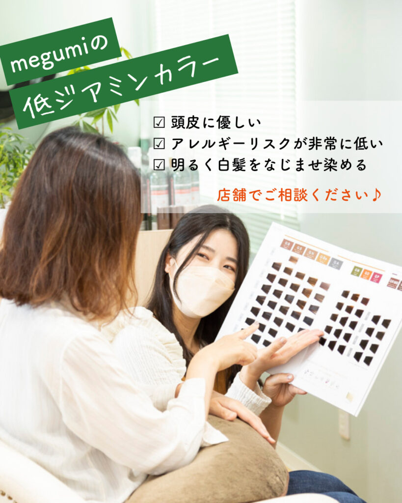 福岡市城南区片江にあるヘアカラー専門の美容室・美容院「頭皮健康&カラーサロンmegumi」では、