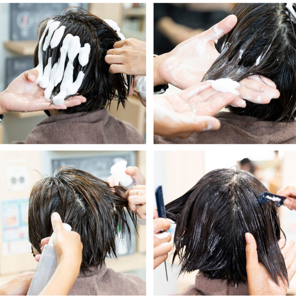 ジアミン染料アレルギーの方やヘアカラーアレルギー、ジアミンアレルギーが不安な方に髪ダメージ(傷みづらい)、頭皮が沁みないフルサポートを行っている