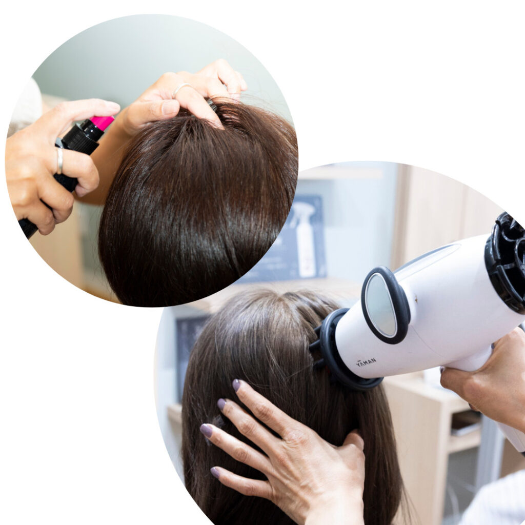 ⑥髪質に合わせてアウトバストリートメントをつけ、ブローで仕上げていく
