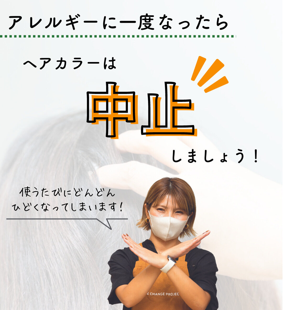 ジアミン染料アレルギーの方やヘアカラーアレルギー、ジアミンアレルギーが不安な方に髪ダメージ(傷みづらい)、頭皮が沁みないフルサポートを行っている