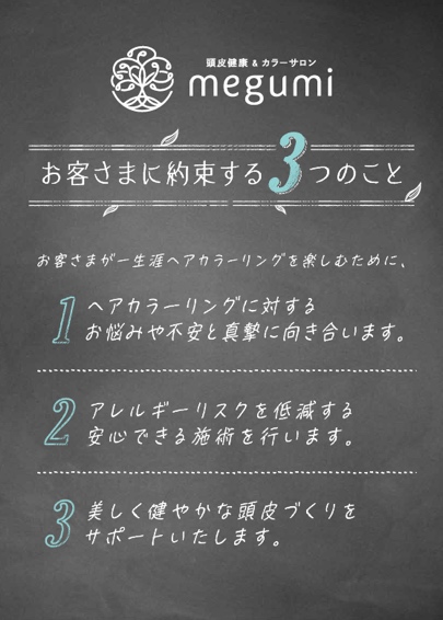 そのようなお気持ちに⼀度でもなられたお客様に安⼼してヘアカラーリングをして頂きたい。「ここなら安⼼」と感じていただくために“megumi”は⽣まれたのです。
