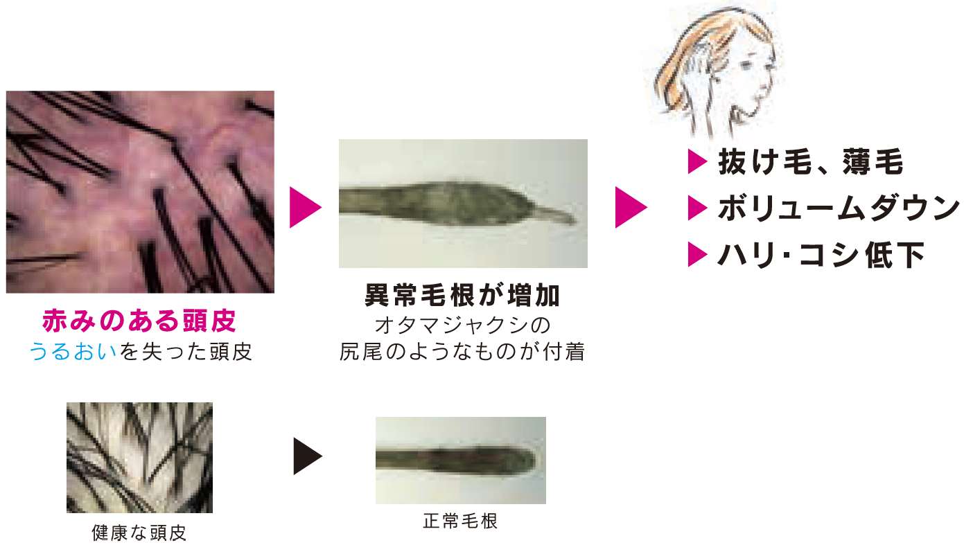 髪質トラブルである「白髪、薄毛、抜け毛、くせ毛、ハリコシ低下など」を引き起こします。